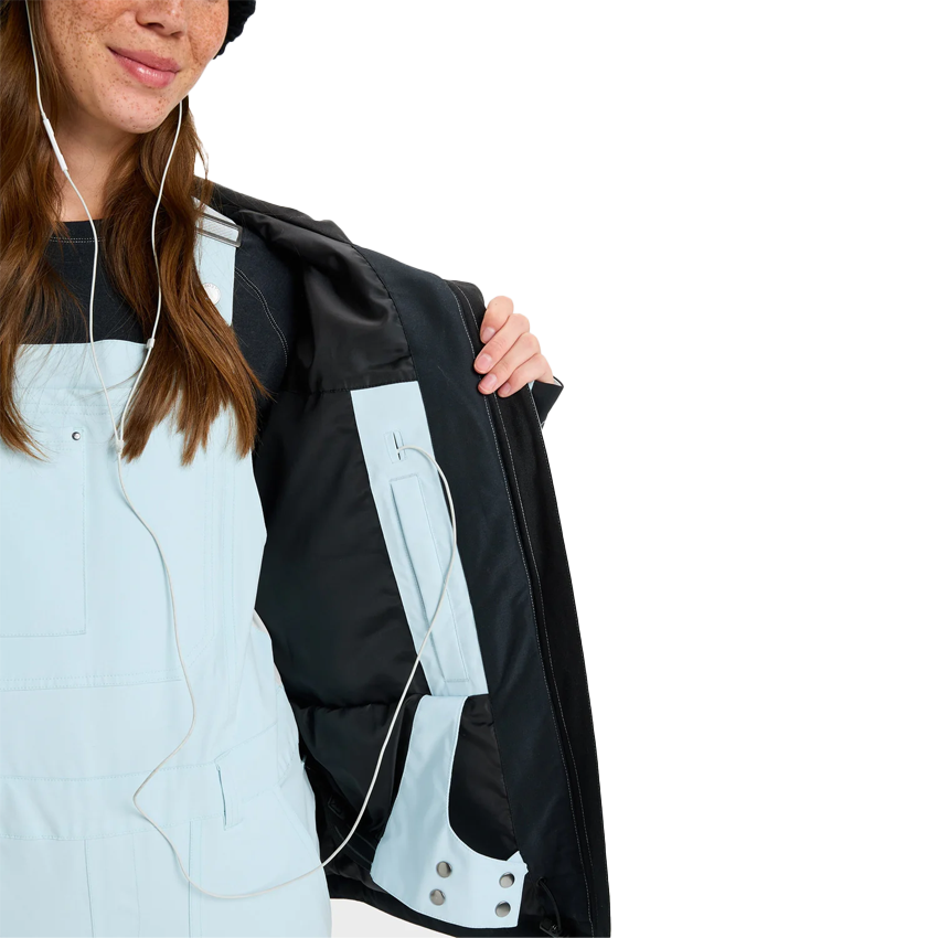 Pockets: 2 zippered handwarmer pocket with key clip, 2 zippered chest pockets, internal media and mesh goggle pocket, sleeve pass pocket